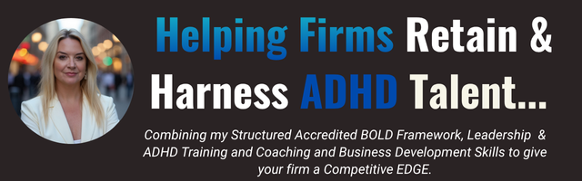 Now, as a Leadership and ADHD Coach & Trainer, I help law firms harness and develop ADHD talent — powered by my structured BOLD Framework to align strengths with the firm’s commercial and talent goals.